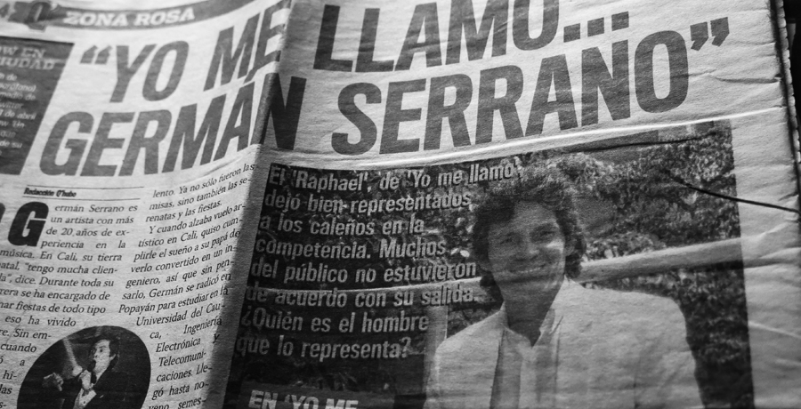 ólo salir de la casa se ha transformado en algo nuevo para él: las personas que lo reconocen y lo saludan en la calle, en centros comerciales, en las iglesias, ya no se limitan a los vecinos del barrio y amigos que ha hecho a raíz de su trabajo. Después de participar en Yo me llamo como imitador de Raphael, Germán Serrano ha tenido una acogida increíble. “Salí de Yo me llamo porque nunca remedaba a Raphael, y Raphael es un súper personaje, es el monstruo de la balada, y remedarlo no se hace en un mes ni en dos meses ni en tres meses. Hay otros participantes, colegas míos, amigos, que llevan cinco años haciendo el personaje. Entonces era muy complicado estar uno pensando en la risa, en la mirada, en los ojos de loco, en la boca, en la mano, en el pie. El personaje iba bien, como lo afirmaron Jairo Martínez, Luz Amparo Álvarez y Julio Sabala. También la misma Amparo Grisales, ¿no? La cosa iba bien, llegó hasta donde debía darse y así estuvo bien”. Luego de un silencio, aclara: “Mi timbre natural es Raphael, yo no estaba remedando a Raphael en la voz, yo estaba cantando como canto yo. O sea que llegué al concurso con mi voz, no con la voz de Raphael”. ¿Entonces no pensaba dedicarse a la imitación de Raphael como carrera musical? “Yo siempre he sido Germán Serrano artísticamente, eso es importante. Se presentó un concurso de imitación, Yo me llamo, y aprovechando mi timbre parecido al de Raphael yo me coloco a imitar al personaje para lo que requiere el concurso”. Me habla entonces del concurso Émulos de Todelar, en el que participó y ganó en Octubre de 2013: “Cuando salí del concurso de Todelar yo seguía con mi proyecto musical ‘Germán Serrano’, como me conocen aquí en Cali, ¿si pillás?” ¿Entonces entró al concurso sólo por el premio?, le pregunto. Él curva la boca hacia abajo y mira hacia el techo antes de responder: “Decir que por el premio… te cuento que no fue un aspecto fundamental. Por darme a conocer. Porque es que uno con quinientos millones de pesos no se da a conocer; con quinientos millones de pesos te sacan dos veces en televisión y listo, se acabó. ‘Yo me llamo’ es un concurso que proyecta a nivel mundial al cantante, al músico, más que los otros concursos. Hay demasiada calidad artística aquí en Colombia, demasiada. Pero también se necesitan millonadas de pesos para publicidad, para que si no es tan bueno termine gustando. En el teatro, en todo. ¡En la pintura! Tú ves unos mamarrachos de cosas impresionantes, impresionantemente horribles, y los verdaderos artistas allá…”. Y sus ojos están, por supuesto, en los cuadros de su papá.