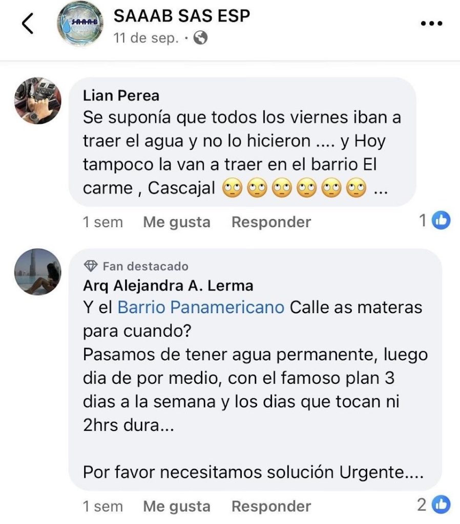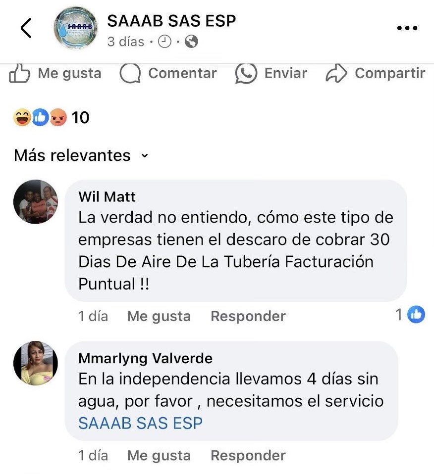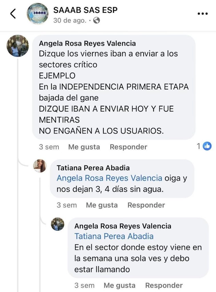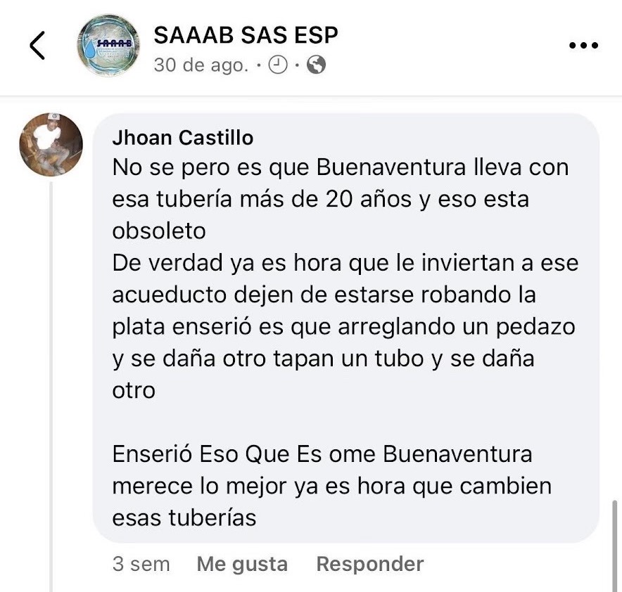 Además, un número creciente de ciudadanos en Buenaventura elige expresar sus quejas sobre el servicio de acueducto a través de diversas plataformas digitales de la SAAAB, como Facebook. Estas son un claro reflejo de la frustración y el descontento de la comunidad, que se siente afectada por la falta de un suministro de agua adecuado. Las plataformas digitales han emergido como un canal fundamental para que los habitantes de la región hagan oír sus voces y demanden mejoras en la infraestructura y el servicio de sus barrios.