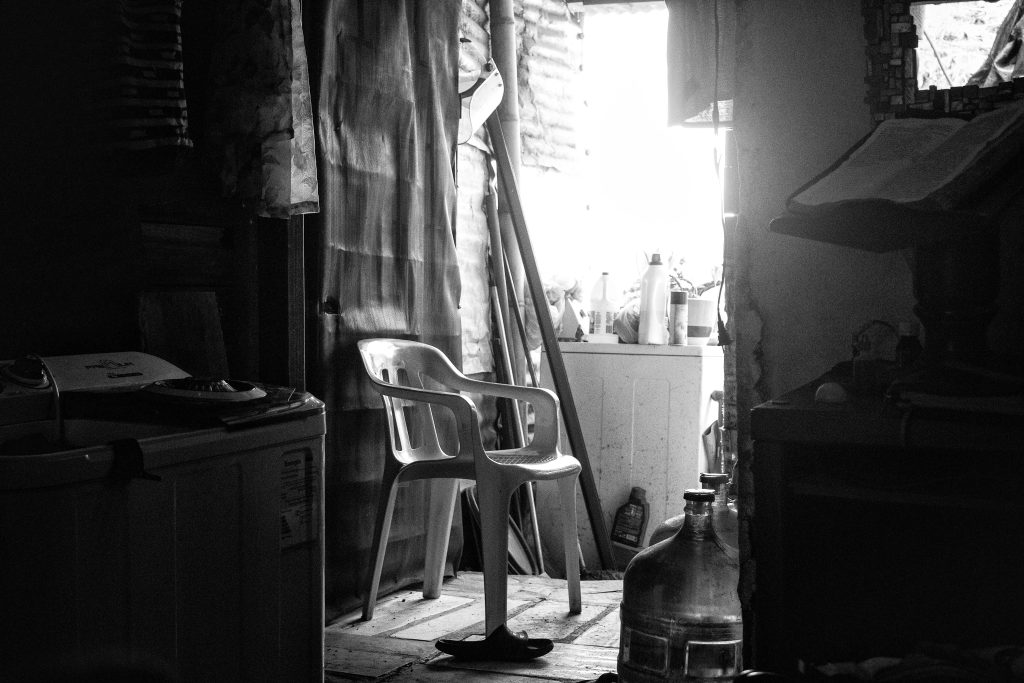 Son abundantes las sillas plásticas de color amarillo, las cuales fueron de las pocas cosas que viajaron con ellos desde Barranquilla, cuando la familia decidió migrar como consecuencia de la delincuencia común, las extorsiones y los homicidios. José Félix alcanzó a pagar una “vacuna” de un millón de pesos producto de la extorsión. Esa fue la gota que colmó el vaso. Las amenazas constantes y el miedo de no poder proteger a su familia los obligaron a abandonar Barranquilla. La casa que habían construido allí quedó al cuidado de su hijo Breinner, quien aún la habita. Esa casa está ubicada junto a la carretera en la ampliación Barranquilla – Santa Marta y la familia espera que, en algún momento durante el próximo año, el Estado se ofrezca a comprarla. Con esa promesa, y con lo poco que pudieron llevarse, llegaron a La Buitrera. Las sillas se utilizan en el desarrollo del culto a la fe cristiana que Ana adquirió tras la muerte de su hijo Edwin, pues él era cristiano y siempre quiso que ella también lo fuera. Su creencia la ha ayudado a soportar el duelo, manteniendo la esperanza de que su muchacho se encuentra en un lugar mejor.