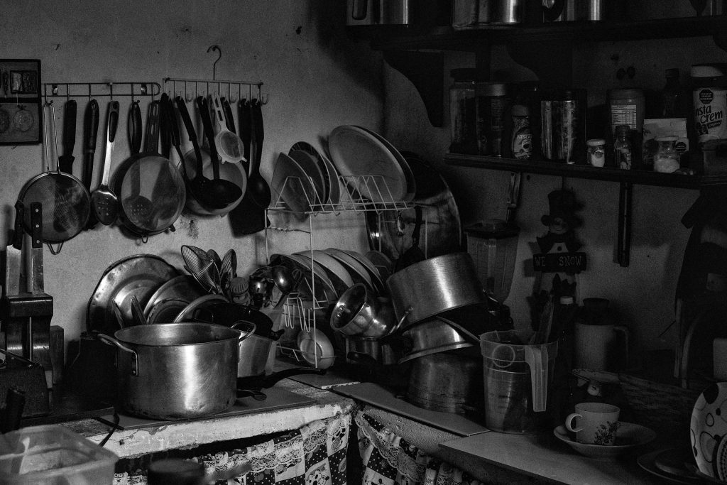 En la cocina abundan electrodomésticos viejos y descompuestos, al igual que la acumulación de ollas, platos, cubiertos y otros utensilios, el espacio está saturado. Entre los enseres se encuentra una lavadora antigua, pequeña, pero aún funcional, así como numerosos objetos recolectados o reutilizados que dan cuenta de una lógica de aprovechamiento y conservación de todo aquello que llega al hogar. Cuadros, relojes o figurines cubren paredes y superficies; ropa, colchones y lámparas se lavan diligentemente y se organizan antes de ser almacenados.