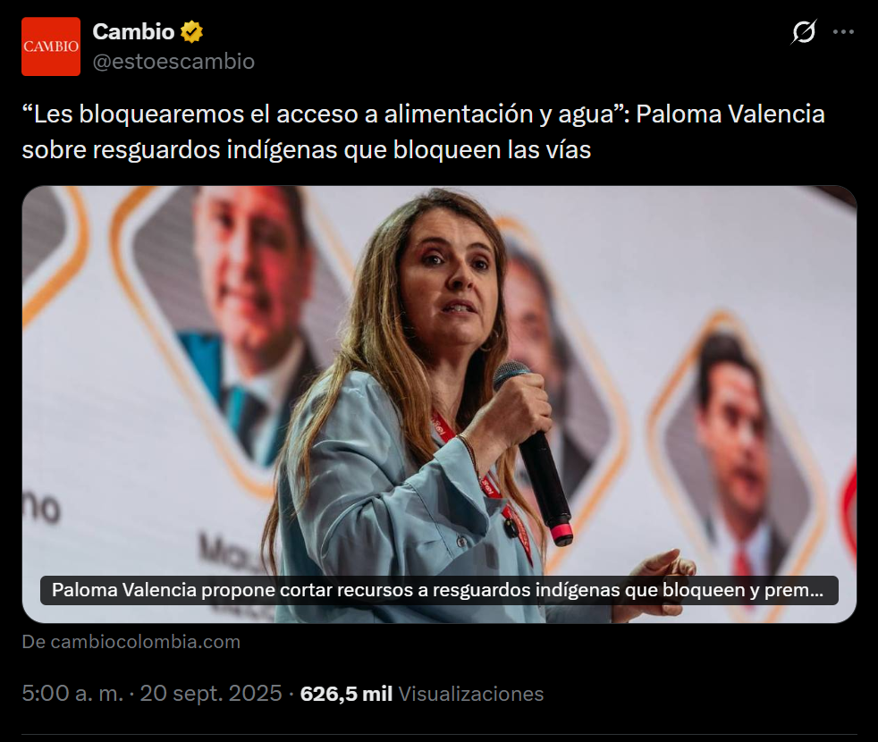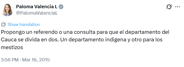 Décadas más tarde, esta tensión histórica parece haber encontrado un eco moderno. En 2015, la actual senadora propuso a través de su cuenta de X una consulta para dividir el departamento del Cauca en dos: una mitad para el sector indígena y otra para el mestizo. A pesar de que la propuesta data de la década pasada, es importante observar cómo la candidata presidencial retoma el discurso de su bisabuelo, evidenciando la prevalencia de ideas conservadoras que beben de una tradición colonizadora. Sus declaraciones resultan en especial inquietantes al tratarse de un departamento que alberga al 20% de la población indígena del país.