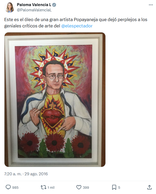 Es más, la candidata presidencial tiene en la sala de su casa un cuadro pintado al óleo del Sagrado Corazón de Jesús con el rostro del expresidente Uribe, reforzando así la narrativa de que ella es “la de Uribe”, tal como rezan las vallas publicitarias desplegadas a lo largo del país. Esta devoción no solo subraya su fidelidad política, sino que termina por subordinar su propia imagen a la sombra del “eterno presidente”.