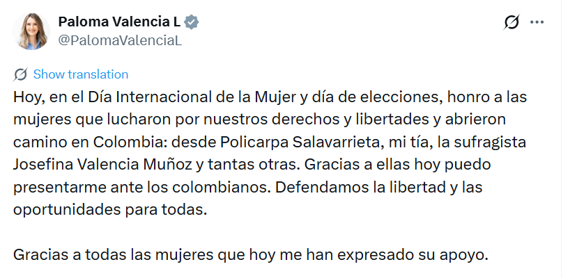 Ese día, junto con las elecciones legislativas, se realizó la consulta interpartidista para definir los tres candidatos presidenciales entre la Gran Consulta por Colombia, la Consulta de las Soluciones y El Frente por la Vida. Valencia —abogada, columnista, actual senadora de la República por el Centro Democrático y uribista orgullosa— obtuvo 3,2 millones de votos y enmarcó su resultado como un logro para las mujeres de todo el país. Un logro porque, según lo expresó en su discurso, después de 200 años Colombia está más cerca de que una mujer ocupe la Casa de Nariño.