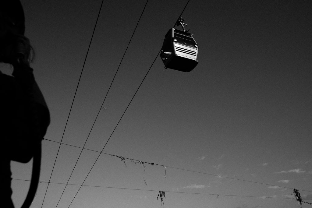 Los topes amarillentos no me dejan zigzaguear como antes, cuando solo había una línea blanca intermitente en su lugar. Ahora solo puedo mirar hacia adelante, sin más, como un caballo chicaneando sus viseras, aunque al menos yo puedo mirar con calma hacia los lados. Miro a la derecha y una vista sospechosamente ligera y aburrida me espera: algunos almacenes, una bomba de Terpel y más edificios. Por la izquierda hay mucho más para ver: los afortunados en su carro y los afanados de las motos; un poco atrás todo el carril del MIO y más allá la Plaza de Toros. Y mucho, muchísimo más atrás, hay una montaña inmensa con un millar de casas sembradas y una estrella. A lo lejos también se alcanzan a ver unas cajitas azules que cuelgan por el aire y rondan sobre la loma, son las cabinas del MIO Cable.