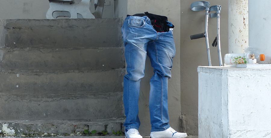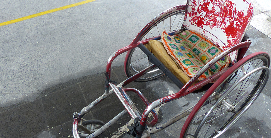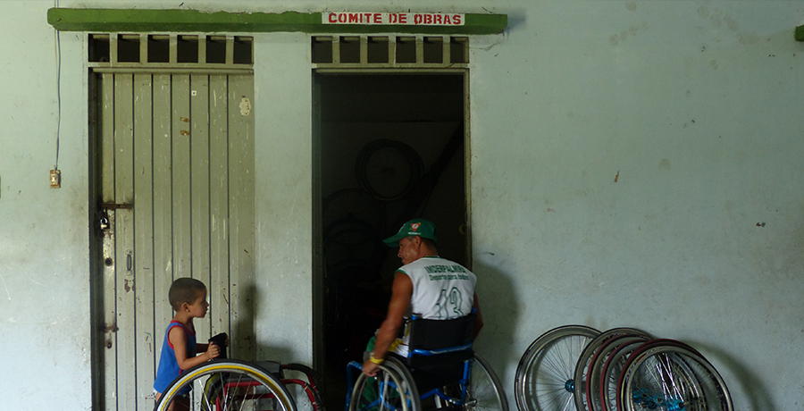 Como Livintong no ha llegado, la esposa de Elkin –morena, callada– lo ayuda bajando la silla de ruedas de la parte de atrás del carro. Elkin avanza hasta que sus ruedas se encuentran con lo que alguna vez fue una rampa de acceso al polideportivo. Ahora no es más que un pedazo de cemento resquebrajado en el que las sillas se atascan, pierden el apoyo y patinan.