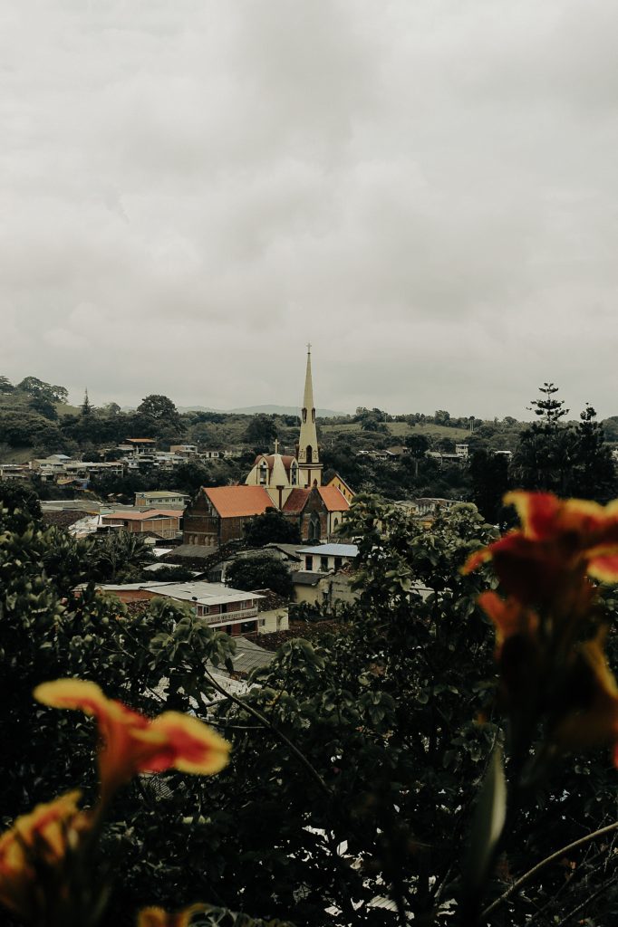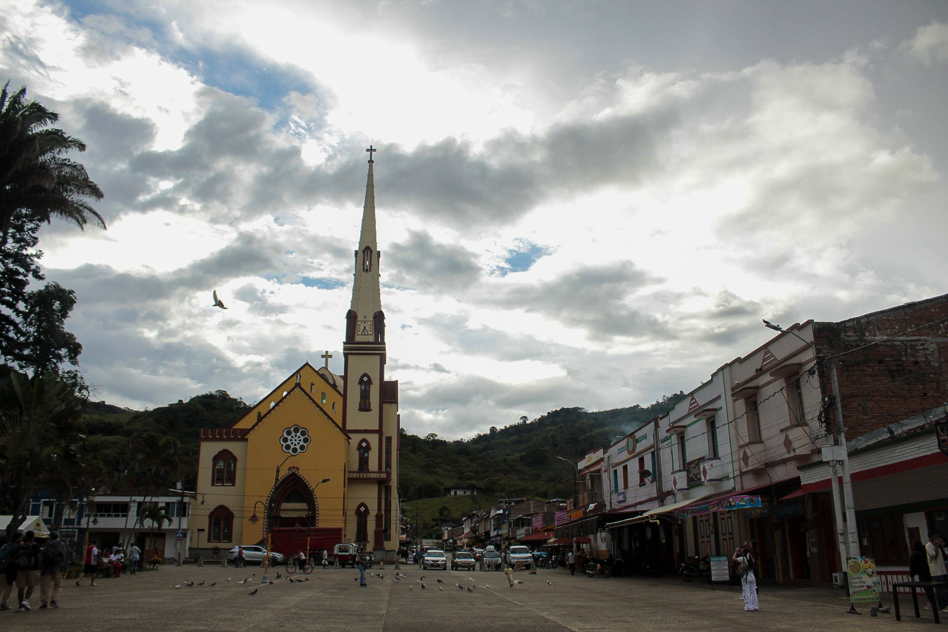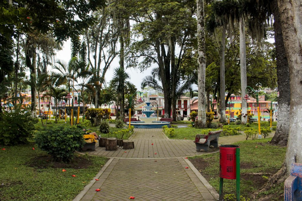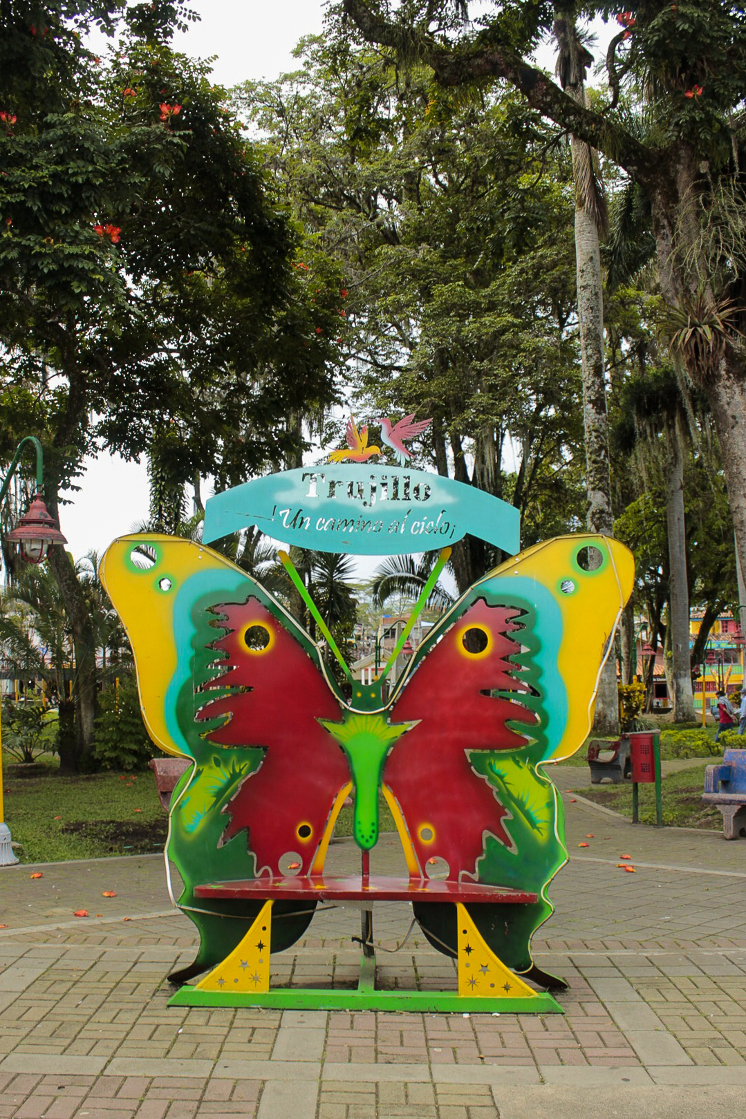 La plaza principal, como la de todo pueblito en Colombia, está rodeada de tiendas de mercado, restaurantes con comida típica de la región, cantinas, heladerías, asaderos y panaderías, y la atracción principal: la parroquia puntiaguda, de amarillo triste y relieves rojizos, Nuestra Señora del Perpetuo Socorro. La plaza, que por años fue testigo de la violencia del municipio, que oyó los susurros de las historias desgarradoras y la llegada de las familias destrozadas que despedían por última vez a sus muertos en la parroquia, hoy es un lugar de encuentros, de risas, de apuestas, del rebusque y del turismo. Las palmas altas, los árboles de flores naranjas y vibrantes, los guayacanes aún verdes y los nogales llenos de musgo sirven de sombrilla a las banquitas de colores desconchados, decoradas con placas que guardan los apellidos de diferentes familias trujillenses; algunas, incluso, tienen grabados nombres de los negocios más emblemáticos, como “Comidas Rápidas Todo Rico”.