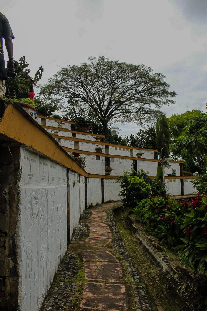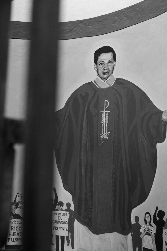 «En el Parque Monumento trabajamos con jóvenes, hace poquito es que empezaron a tener más conciencia de lo que hacemos aquí. Pero antes no, porque tenían una percepción negativa del Parque. Ellos creían, como muchos adultos también, que esto era negativo para el pueblo porque estar recordando lo que ocurrió, esa historia triste y dolorosa, no le ayudaba al pueblo, no atraía a personas que quisieran invertir o comprar lotes, sino que las espantaban», dice, mientras continúa el camino hacia el siguiente tramo: el mausoleo del padre Tiberio. Está en la cima de la colina, de copa redonda y blanca, cerrado por una verja negra. Al entrar, el sitio es un lugar de descanso contra el sol ardiente. En la pared frente a la entrada reposa una cruz, en la pared derecha hay un mural del padre Tiberio acompañado de habitantes del pueblo, en la pared izquierda hay un cuadro del cuerpo desmembrado del sacerdote. En medio del recinto descansan los restos de su cuerpo dentro de una cripta.