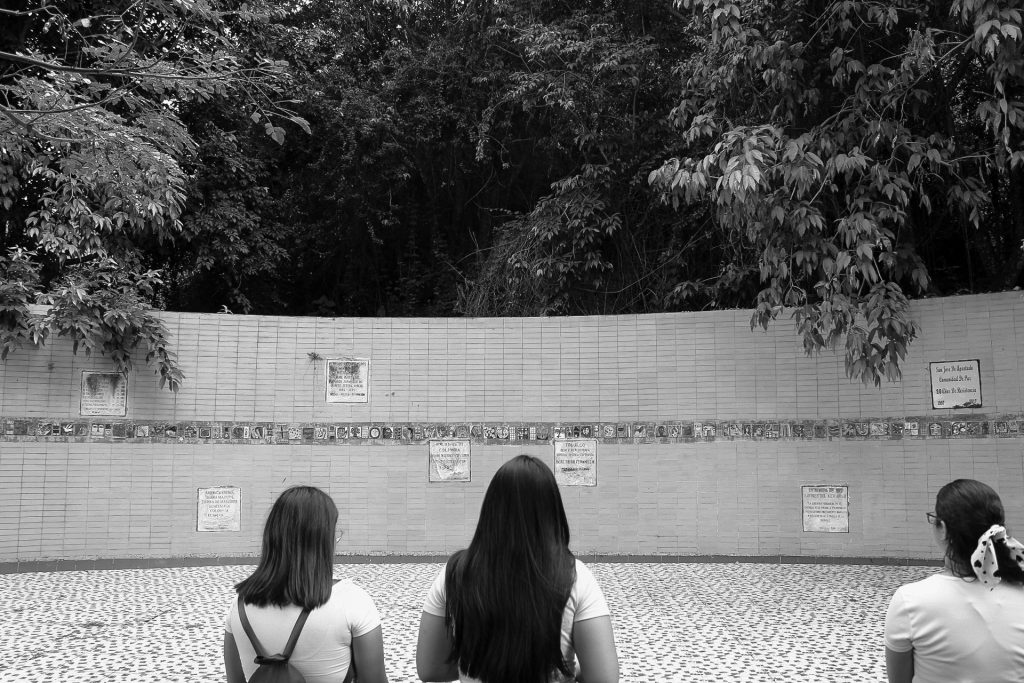 Para llegar al Parque Monumento hay que subir una loma estrecha y empinada. Es un trayecto corto que comienza con las casitas del pueblo y termina rodeado de árboles frondosos. Un portón grande indica la llegada al Parque, un lote de 63 mil metros cuadrados, que equivale a casi 15 veces la plaza principal del pueblo. La mayor parte del espacio lo compone una reserva natural. Las estructuras de ladrillo y cemento, algunas decoradas con murales y dibujos infantiles, otras con macetas colgadas en las paredes, cumplen diferentes funciones dentro del Parque. La principal es el museo en el que se custodia la memoria con fotos, carteles, diagramas, libros y murales referentes a la violencia en Trujillo y en todo el país. Es de dos pisos, rodeada de plantas ornamentales y un pequeño muro con piedras incrustadas pintadas de amarillo, verde y azul y letras dibujadas que conforman frases como “Trujillo renace con dignidad”. También, es el espacio donde se conversa, se comparten las historias y los recuerdos, donde los sentimientos afloran y el corazón se sincera.